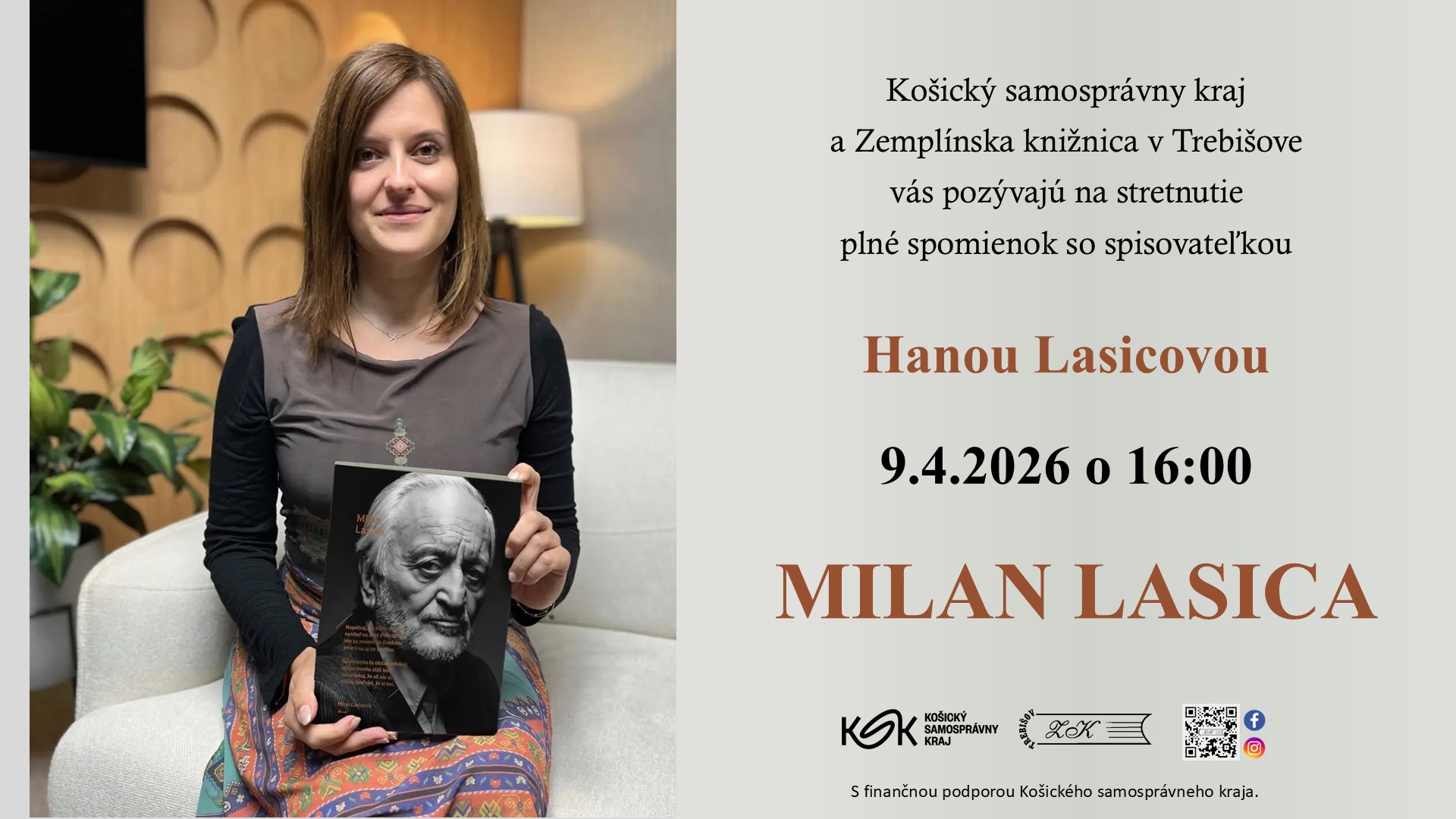 Stretnutie v knižnici venované osobnosti Milana Lasicu prinesie návštevníkom príjemný a podnetný večer plný spomienok, humoru i zamyslení. Hosťkou podujatia bude jeho dcéra, spisovateľka Hana Lasicová, ktorá pútavo priblíži nielen umelecký, ale aj osobný život svojho otca. Prostredníctvom autentických príbehov a spomienok predstaví Milana Lasicu ako výraznú osobnosť kultúrneho života i ako človeka s jedinečným pohľadom na svet.