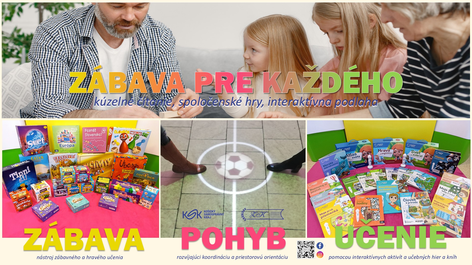 Hry náhodných detských návštevníkov knižnice na interaktívnej podlahe, pri kúzelnom čítaní s elektronickou ceruzkou a interaktívnou hovoriacou knižkou, spoločenské, vzdelávacie a vedomostné hry.